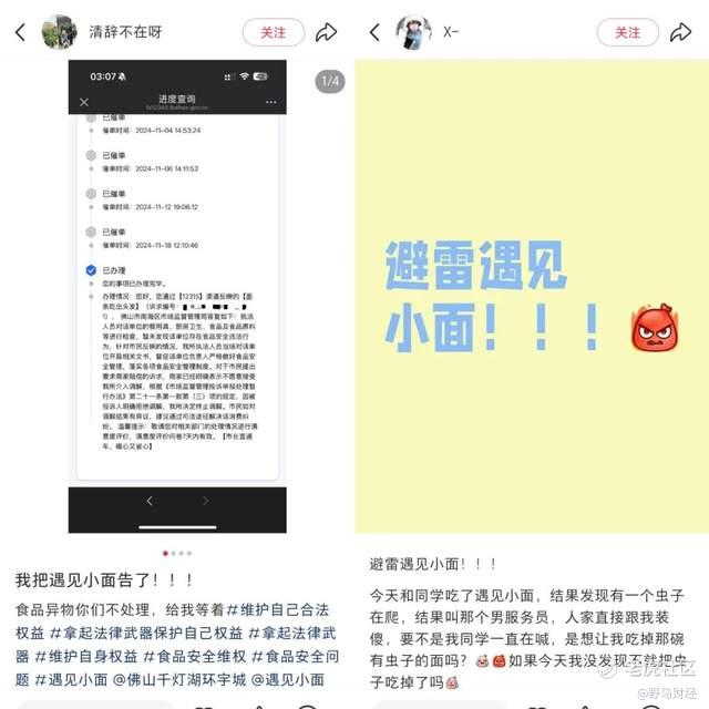 而现实中,品牌口碑已出现松动迹象。在社交平台小红书上,有网友吐槽在遇见小面的餐品中吃出虫子。黑猫投诉平台上,同样存在消费者的负面反馈,有消费者称“肉丸里吃出棉线”,还有消费者表示,吃完豌杂面后腹痛腹泻,甚至患上急性肠胃炎。