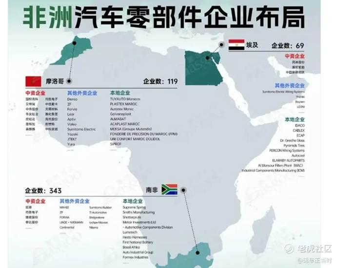 其中南非凭借相对完善的产业配套基础,聚集了343家企业。延锋、均胜电子、继峰股份等中资头部企业已在此落子布局,推动与当地产业链上下游的联动衔接。摩洛哥与埃及市场集聚超180家汽车零部件企业