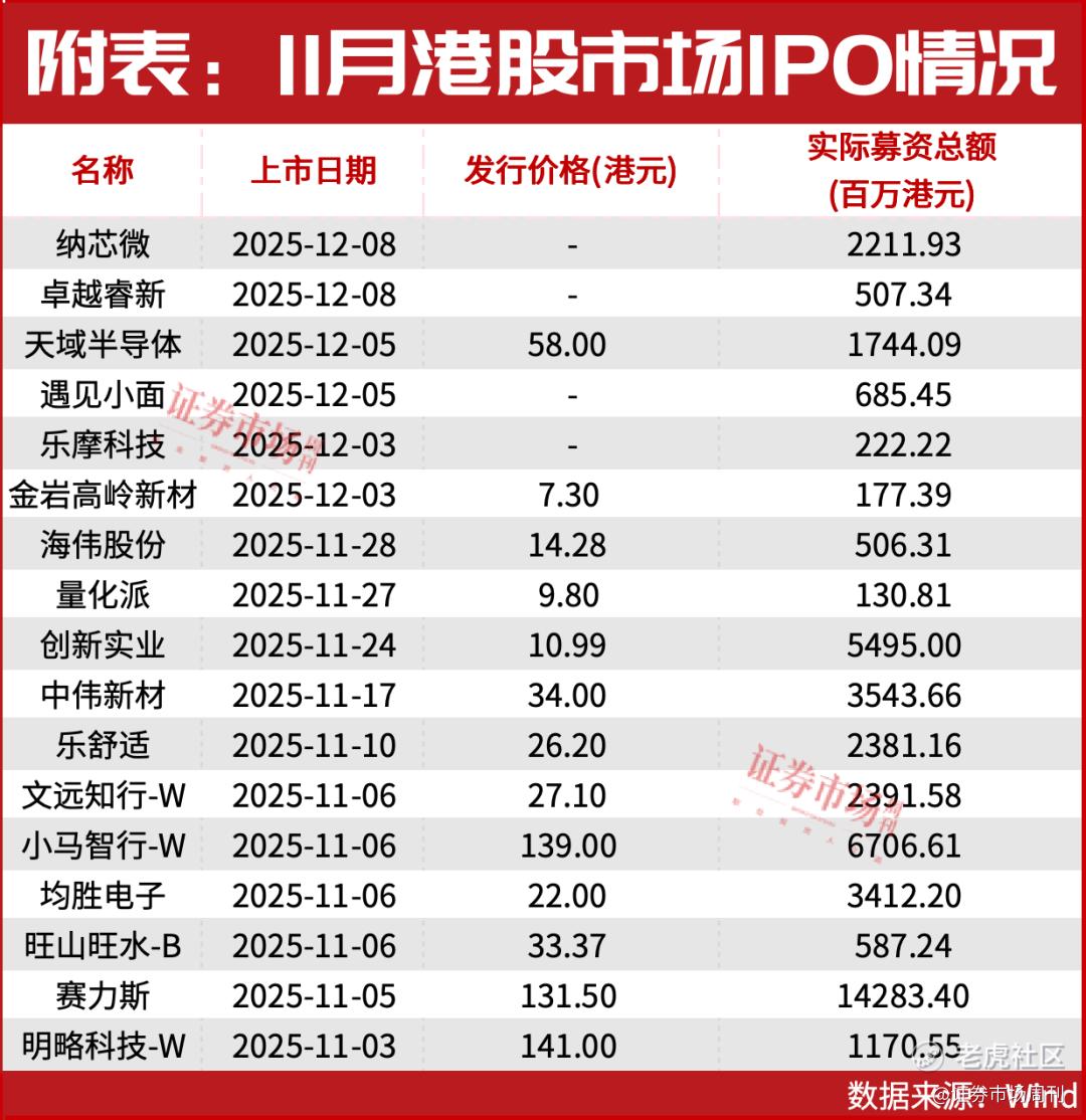 科技龙头登陆港股市场呈现加速趋势。据Wind统计,在今年港股市场IPO的96家公司中,11月份发行上市的公司有17家,创出年内月度上市高峰。据了解,纳芯微、天域半导体、创新实业、文远知行-W、小马智行-W、均胜电子、赛力斯均位列其中,这些公司分属半导体、有色金属、软件服务、汽车与零配件等行业,单家公司募资金额均在10亿港元以上(见附表)。