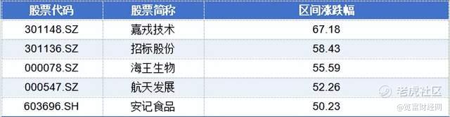 个股方面,本周个股涨幅榜前五位分别是嘉戎技术、招标股份、海王生物、航天发展、安记食品,累计涨幅分别为67.18%、58.43%、55.59%、52.26%、50.23%。