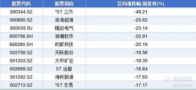 本周个股跌幅榜前五位分别是ST立方、滨海能源、精创电器、浪潮软件、昀冢科技,累计跌幅分别为48.21%、25.82%、23.14%、20.91%、20.19%。