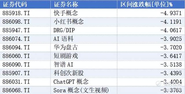 本周,下跌板块较多,达196个,排在跌幅榜前排的概念板块分别是快手概念、小红书概念、DRG/DIP,累计跌幅分别为4.94%、4.12%、4.06%。