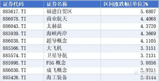 板块方面,本周涨幅居前的概念板块分别是福建自贸区、商业航天、太赫兹、海峡两岸、超导概念,累计涨幅分别为5.68%、4.41%、4.37%、4.37%、4.11%。