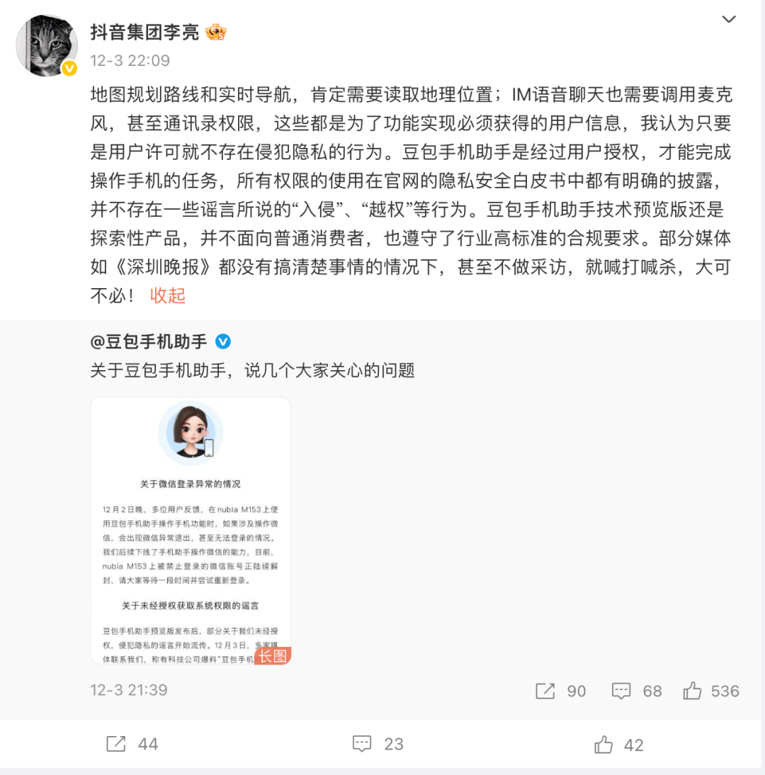 对此,抖音集团副总裁李亮称,豆包手机助手是经过用户授权,才能完成操作手机的任务,所有权限的使用在官网的隐私安全白皮书中都有明确的披露,并不存在一些谣言所说的 “入侵”、“越权”等行为。