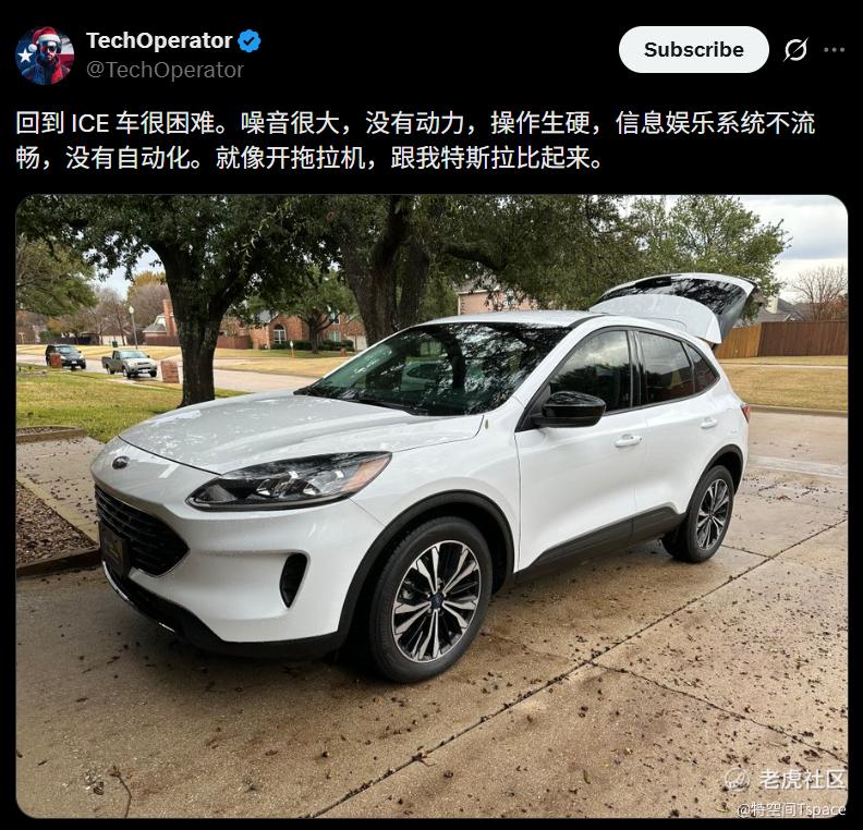 海外网友@TechOperator 结合真实用车感受表示:“燃油车不仅噪音大、动力差、操作生硬,更毫无智能化可言,在特斯拉面前宛如上个时代的拖拉机。”