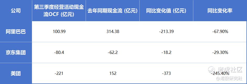 另一方面是现金流,阿里经营活动产生的现金流量净额同比下降68%,但仍然为正数;京东经营活动现金流同比下降29%,负现金流;美团经营活动现金流净流出221亿元人民币,同比减少了373亿元,环比也减少269亿元。