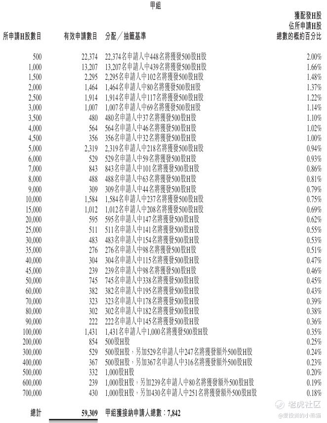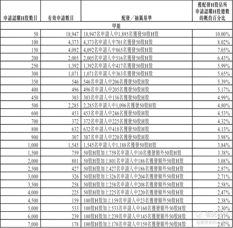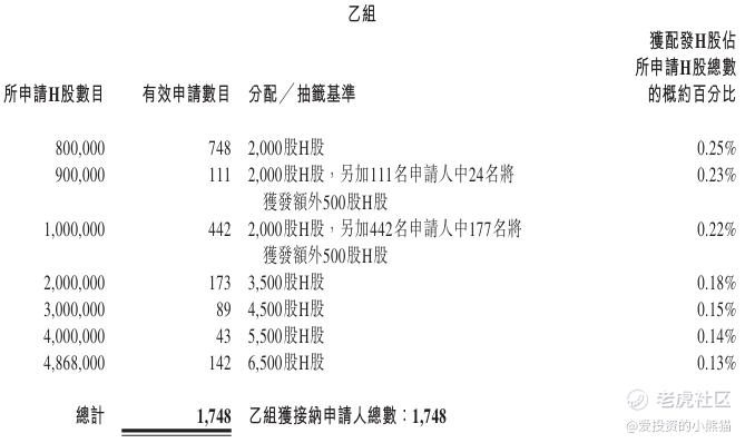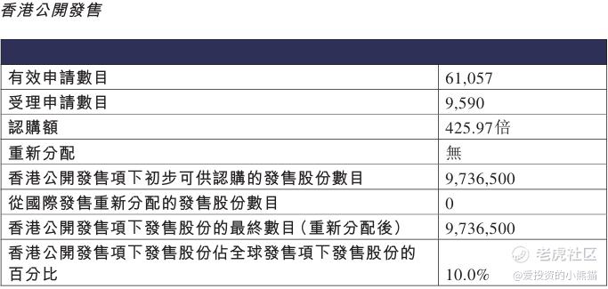 配售情况:61057人认购,这次公配425.97倍,由于执行分配机制B, 回拨比率无,国配有4.99倍,一手中签率2.00%,认购400手稳中1手,同时乙组1748人申购,其中顶头槌申购142张,获配率0.13%-0.25%。