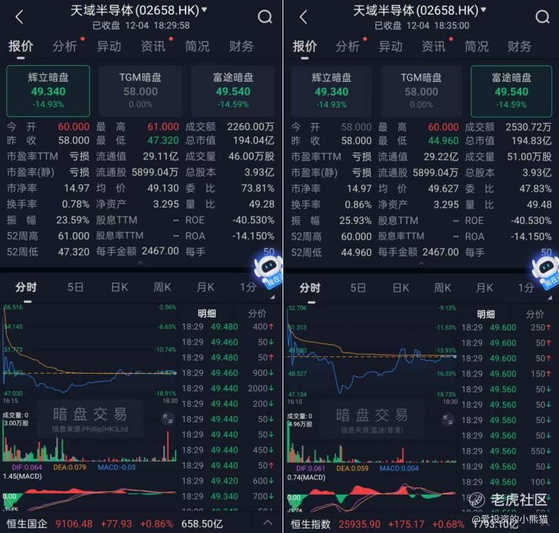 天域半导体(02658.HK)辉立暗盘以60.00港元高开,瞬间冲到最高点61.00港元,就一路回落,最低探到47.32港元,之后企稳反弹,尾盘以49.34港元报收,跌幅为14.93%,振幅23.59%,成交2260万港元。