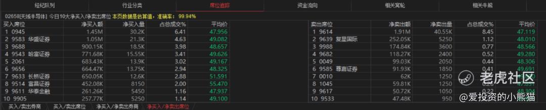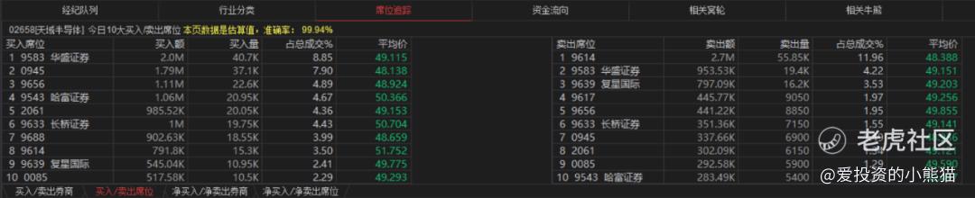 天域半导体(02658.HK)买盘席位有0945、9583、9688等,卖盘第一席位是散户为主的9614。