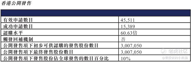 配售情况:45511人认购,这次公配60.63倍,由于执行分配机制B, 回拨比率无,国配有2.47倍,一手中签率10.00%,认购30手稳中1手,同时乙组492人申购,其中顶头槌申购8张,获配率1.27%-1.60%。