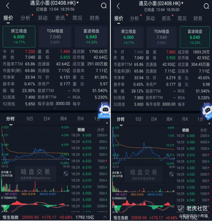 遇见小面(02408.HK)辉立暗盘以7.20港元高开,瞬间拉到最高点7.49港元,立马又回落到最低点5.85港元,之后企稳反弹,再震荡盘整,尾盘以6.00港元报收,跌幅为14.77%,振幅23.30%,成交1790万港元。