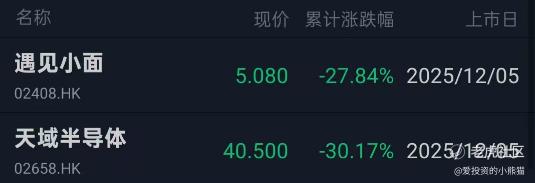 12月5日,港股市场两只新股 $遇见小面(02408)$ 与 $天域半导体(02658)$ 同步挂牌,却双双遭遇开盘即破发的窘境,午间收盘时跌幅均超24%,与招股阶段的热度形成鲜明反差。