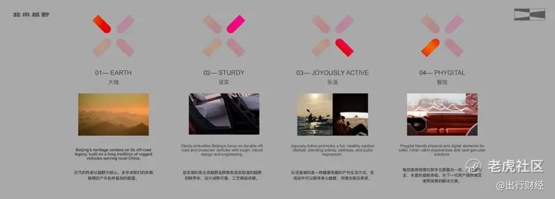 根据介绍,北京越野全新的设计理念命名为“ELEMENTAL”(元素化),建立在四大核心支柱之上,分别是:大地Earth、坚实Sturdy、乐活Joyously Active与智控Phygital。它是一个战略框架,既契合品牌特质,也贴合客户关注的核心——探险、健康与户外生活。从现在起,北京越野将创造性地、持续地将这一理念应用于全系车型。