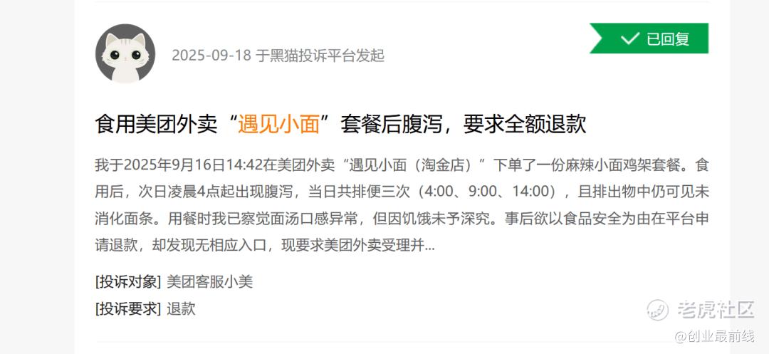 在小红书和大众点评上,也有很多消费者吐槽遇见小面服务差等问题。通过黑猫投诉平台搜索“遇见小面”关键词,相关投诉有80余条,内容涵盖吃出异物、食后腹泻以及诱导充值等问题。