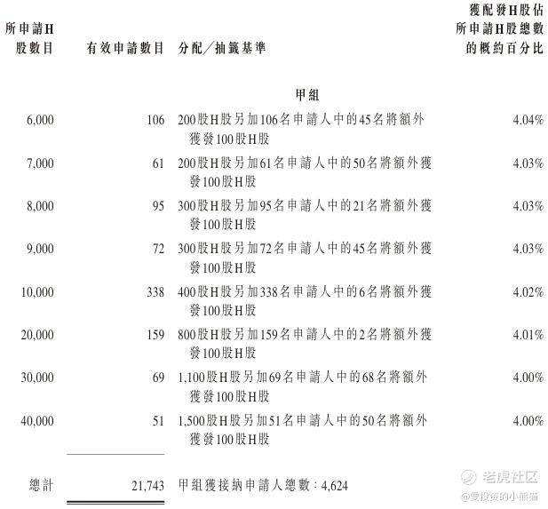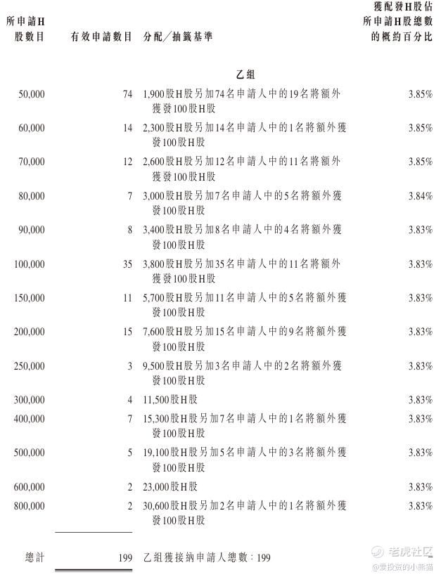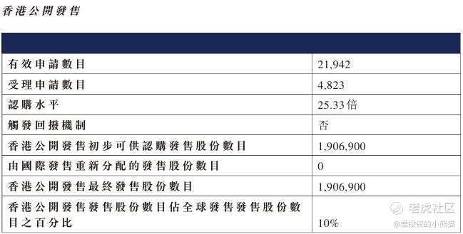 配售情况:21942人认购,这次公配25.33倍,由于执行分配机制B, 回拨比率无,国配有2.65倍,一手中签率4.32%,认购25手稳中1手,同时乙组199人申购,其中顶头槌申购0张,获配率3.83%-3.85%。