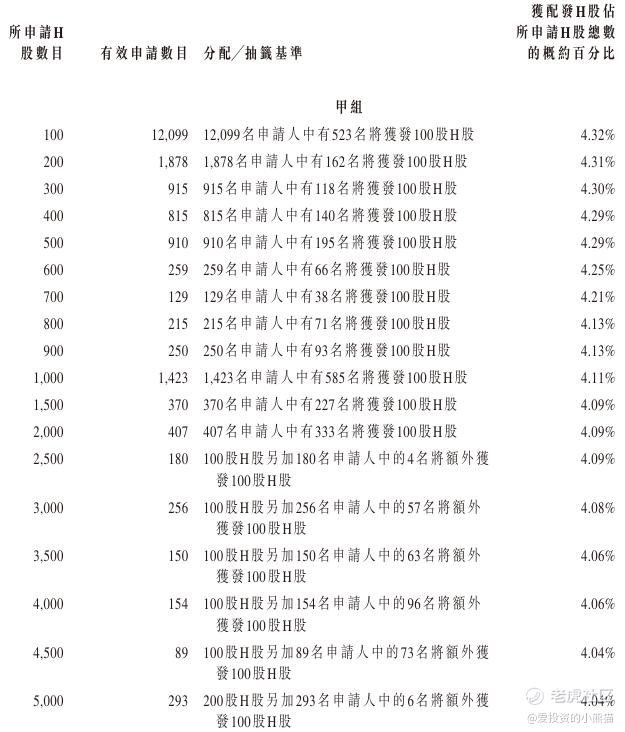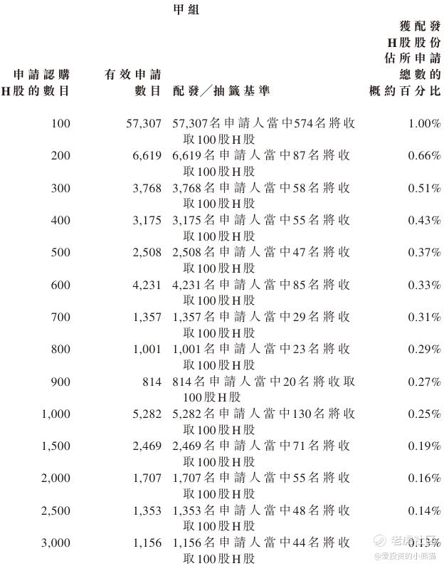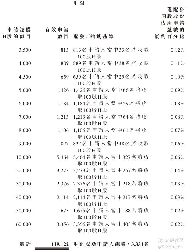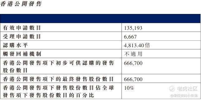 配售情况:135193人认购,这次公配4813.40倍,由于执行分配机制B, 回拨比率无,国配有2.33倍,一手中签率1.00%,公开认购不能稳中1手,同时乙组16071人申购,其中顶头槌申购2742张,获配率0.01%-0.02%。