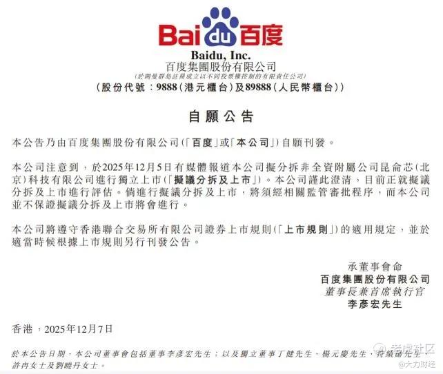 12月7日,百度发布公告确认正评估分拆昆仑芯独立上市,但尚未作出最终决定,后续需通过相关监管审批,不保证事项必然推进,将按港交所规则及时披露进展。