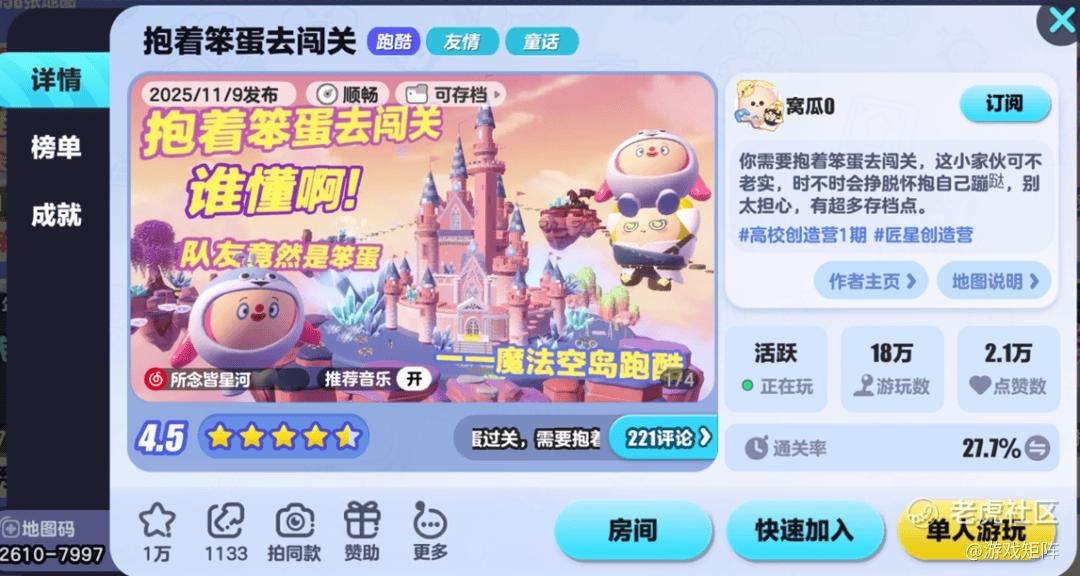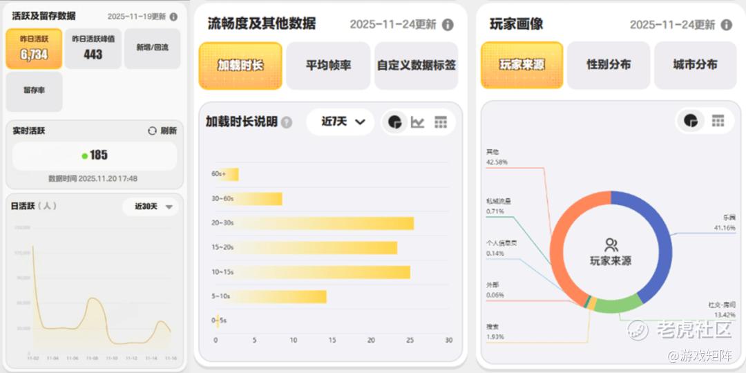 比如,《蛋仔派对》的创作者平台会开放详细专业的数据看板,你可以看到地图的基础游玩人次、平均游玩时长、玩家在各个关卡的流失率、卡顿数据,甚至还有玩家的大致画像,数据维度堪比专业独立游戏后台。当创作者发现部分玩家都在某一环节大量流失,那就得回头去检查,是不是难度突然跳升了,还是指引不够清晰?