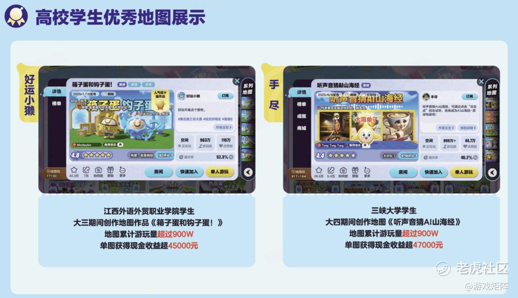 对于高校学生,平台有专门的扶持链路,包括现金奖励、网易实习机会等,帮助他们从学习阶段平稳过渡到独立创作变现。外加端内定期的高校地图赛事,收益还将进一步提升。
