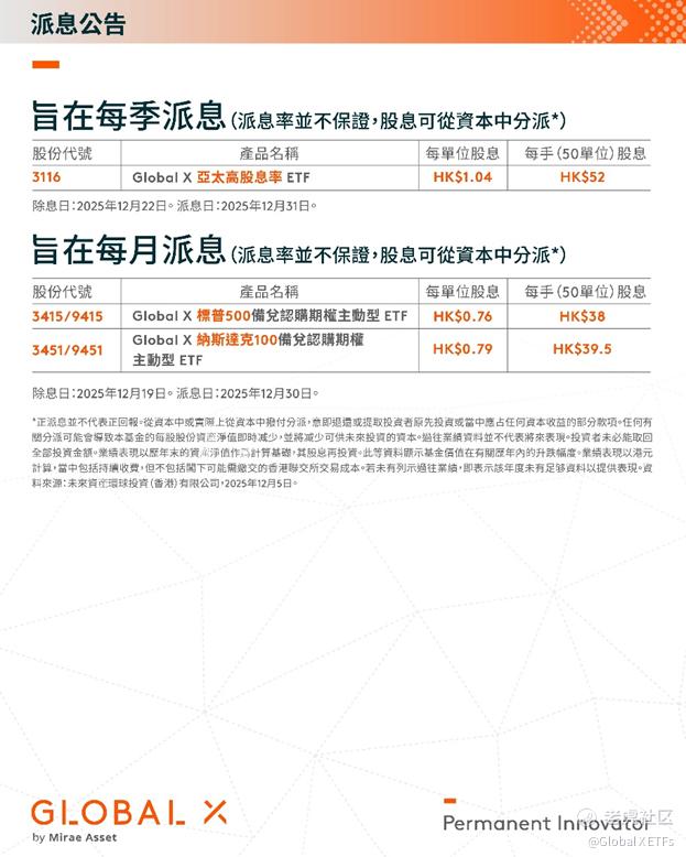 Global X ETFs 旗下部分产品已宣布派息,相关派息金额如下(派息率不保证,且股息可能从资本中分配)*。