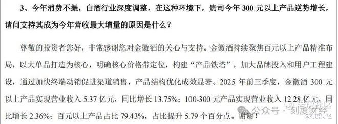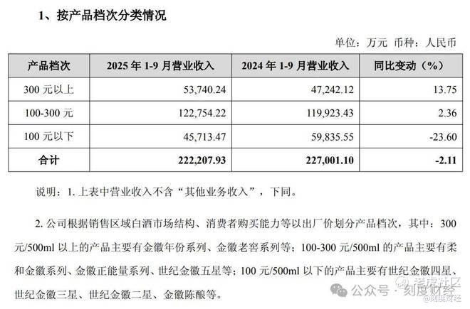 2025年前三季度,金徽酒300元以上产品实现营业收入5.37亿元,同比增长13.75%,占酒类营收比例24.19%,100-300元产品实现营业收入12.28亿元,同比增长2.36%,占酒类营收比例55.24%。100元以下产品实现营业收入4.57亿元,占酒类营收比例20.57%。