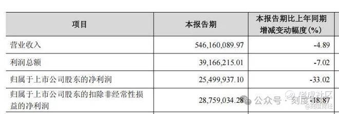 单季公司实现营收5.46亿元,同比下降4.89%。归母净利润仅2549.99万元,同比大幅下滑33.02%。