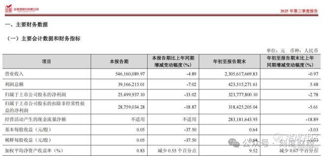 白酒市场步入存量市场,竞争压力加大。四川舍得酒业2025年前三季度营业收入为37.02亿元,同比下降17.00%。归母净利润为4.72亿元,同比下降29.43%;扣非后归母净利润为4.60亿元,同比下降29.69%。