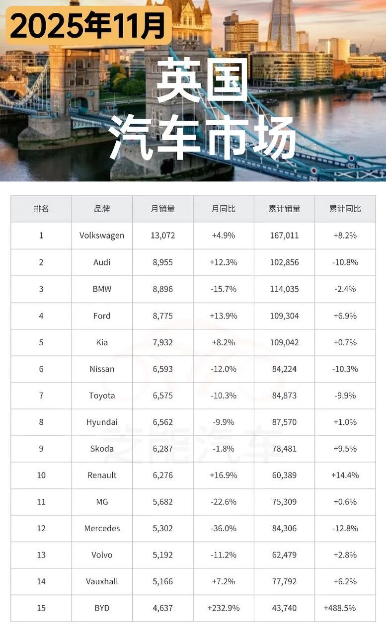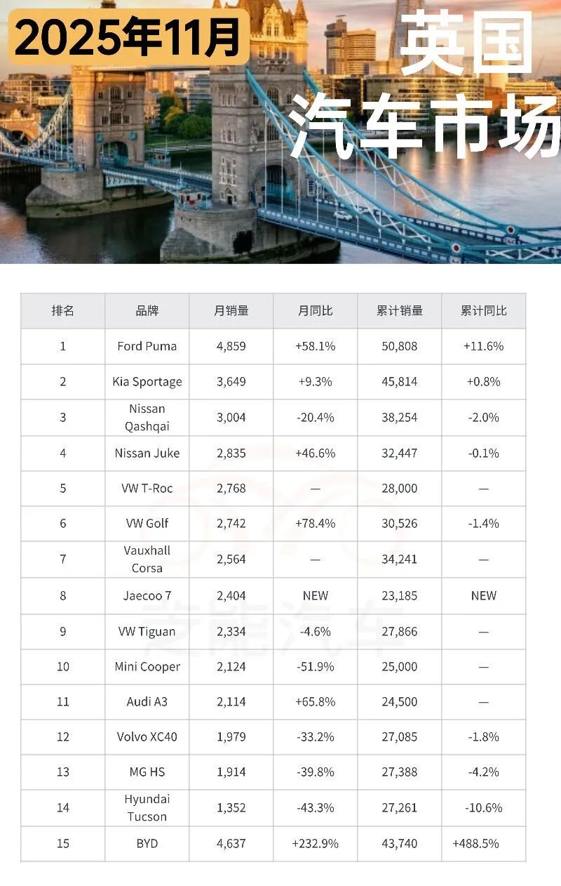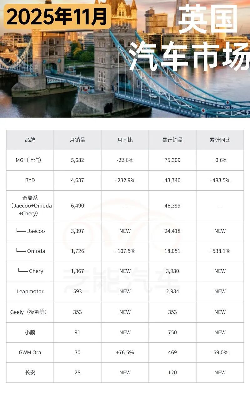 欧洲车市 | 英国2025年11月:中国车企销量爆表,奇瑞破6000,比亚迪破4000