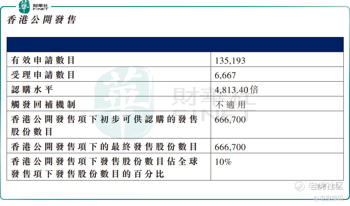 从招股阶段的表现来看,香港公开发售方面,卓越睿新获4813.4倍认购,公开发售的股份最终数目为66.67万股股份,占发售股份总数的约10%。合共接获约13.52万份有效申请,受理申请数目为6667份,申购一手获配发股份占所申请股份总数的概约百分比为1%,意味着一手中签率为1%。