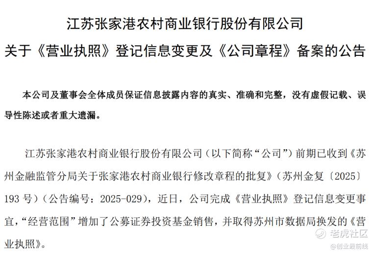 张家港行发布公告称,前期已收到《苏州金融监管分局关于张家港农村商业银行修改章程的批复》:近日,张家港行完成《营业执照》登记信息变更事宜,“经营范围”增加了公募证券投资基金销售,并取得苏州市数据局换发的《营业执照》。