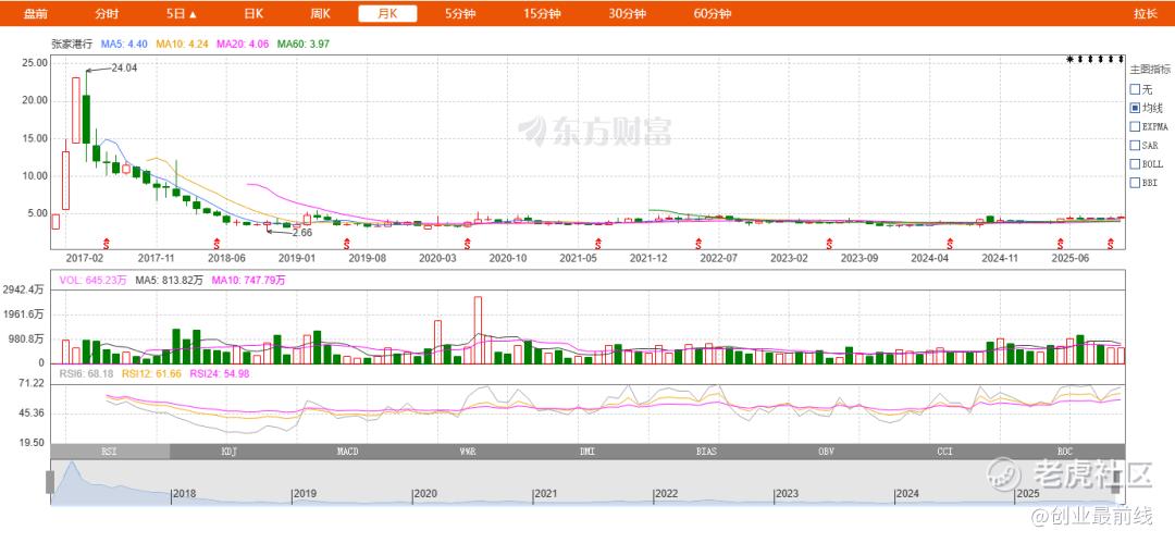 之后,张家港行股价虽偶有起色,但股价始终在低位徘徊,再未回归峰值。截至2025年12月7日,张家港行股价报收4.72元/股,较上市初期的峰值水平下跌80.37%。