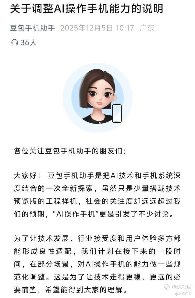 12月5日,“豆包手机助手”发布说明称,将对AI操作手机的能力做了限制,包括限制刷分、金融类应用等。理由是“为了让技术发展、行业接受度和用户体验多方都能形成良性适配”。