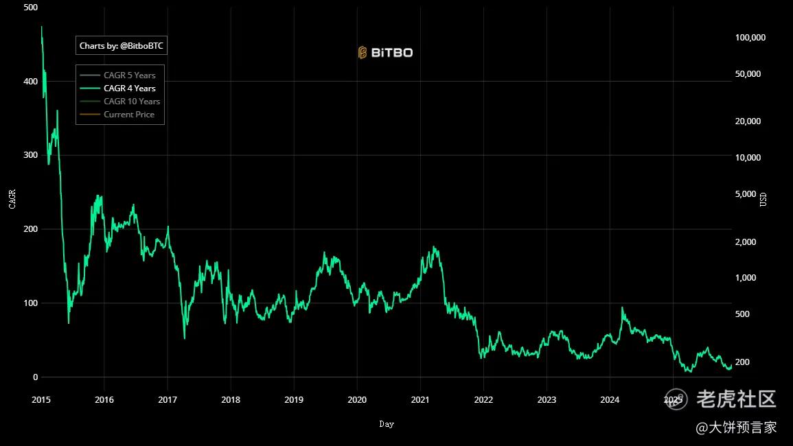 下面这张图就是大饼的CAGR(复合年均增长率),其中绿色线就是4年CAGR,意思就是持有4年,平均每年的年化收益率是多少。