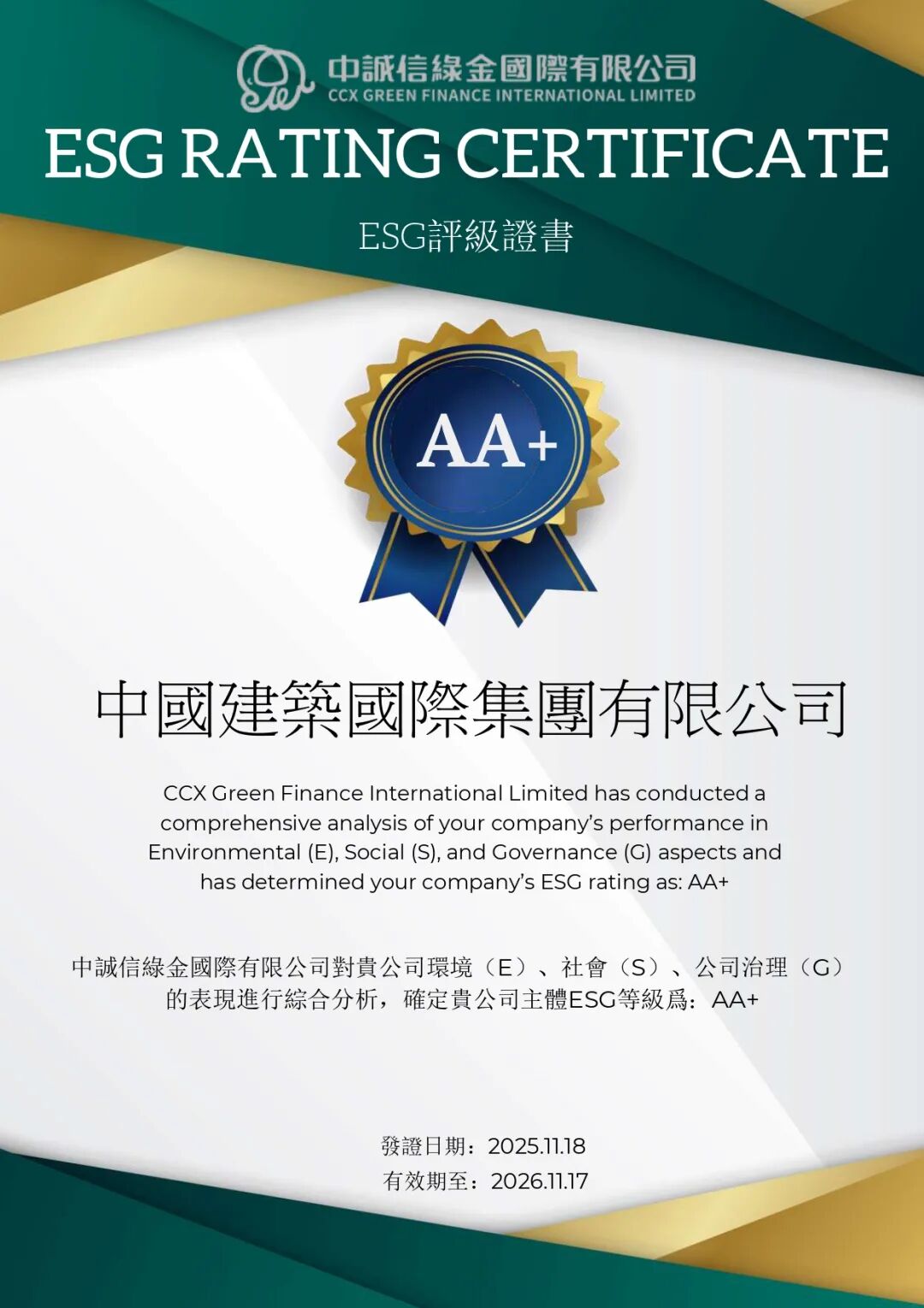 行业第一!中国建筑国际获中诚信绿金国际上调ESG评级至AA+