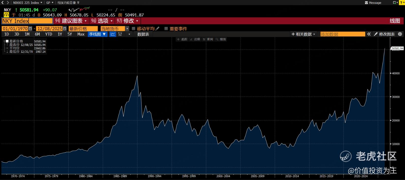 同为东亚文明的日本,曾在1989年达到股市泡沫巅峰,之后楼市崩盘,股市暴跌,虽然现在仍深受老龄化危机,GDP持续萎靡,但日经225指数也早已创下新的记录: