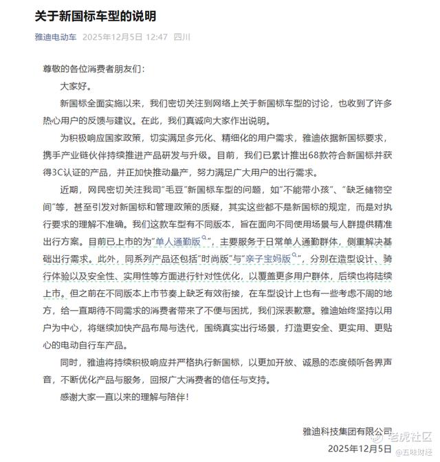 以雅迪“毛豆”车型为例,12月5日雅迪再次发布说明,明确表示网民讨论的铁皮座椅、不能带娃、不能装后座等并非新国标规定,而是企业在执行和版本节奏上理解不到位。