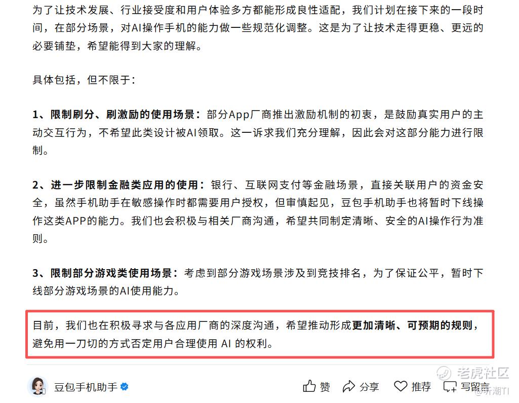 12月5日,豆包团队发布公告,称为了让技术发展与行业接受度良性适配,将对AI操作手机的能力进行“规范化调整”。其中包括限制金融类应用和部分游戏的使用。
