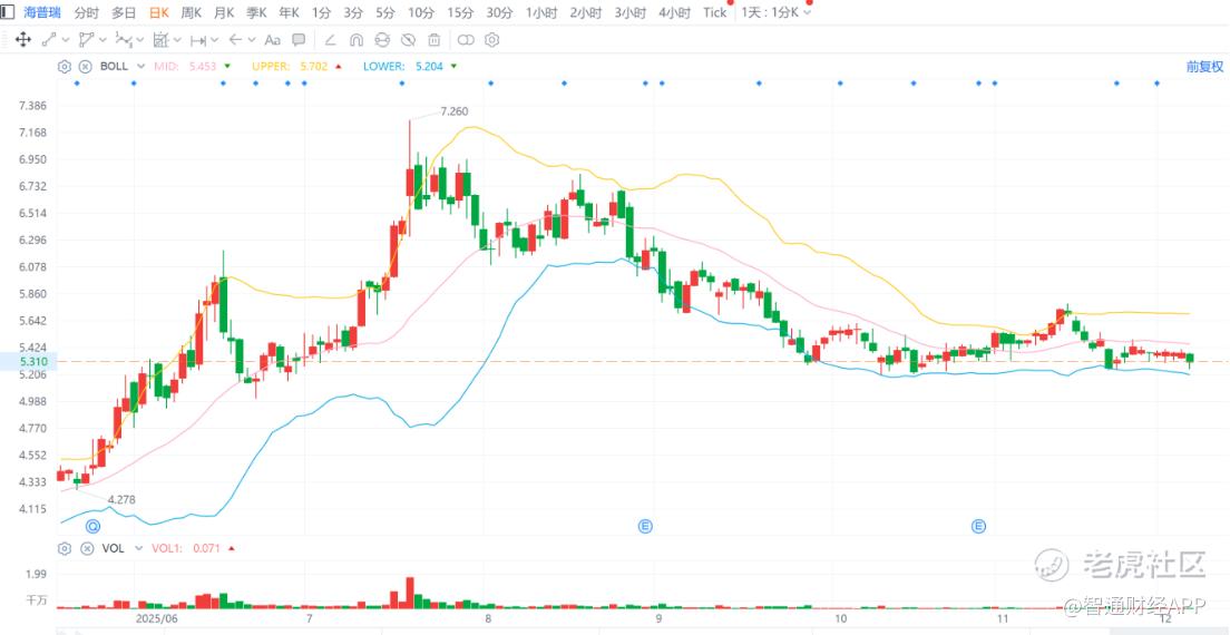 然而股价拉升并未能带动其进一步量价共振上涨。短暂的市场情绪发酵后,海普瑞股价再度进入技术性阴跌循环,6 个交易日从 BOLL 线上轨直跌回下轨,并在中下轨之间低位震荡,股价持续低迷。