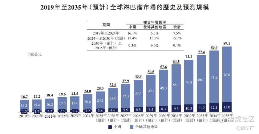 全球淋巴瘤市场:根据弗若斯特沙利文报告,于2019年至2024年,全球淋巴瘤市场由167亿美元增加至240亿美元,复合年增长率为7.5%。此外,全球淋巴瘤市场在不久的将来将持续快速增长。预计于2030年及2035年,全球淋巴瘤市场将分别达到576亿美元及891亿美元,2024年至2030年的复合年增长率为15.7%,2030年至2035年的复合年增长率为9.1%。中国淋巴瘤市场规模于2024年达到32亿美元,于2030年及2035年将扩大至83亿美元及130亿美元,复合年增长率分别为17.4%及9.5%。