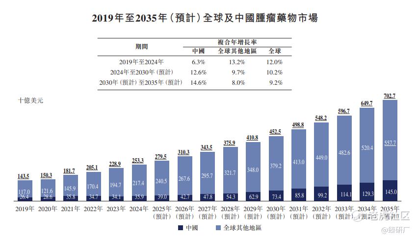 中国肿瘤药物市场:随着经济发展及医疗需求增加,全球及中国医药市场近年来不断增长,其中肿瘤治疗领域分别为全球及中国医药市场第一大及第二大细分市场。根据弗若斯特沙利文报告,全球癌症的发病率由2019年的1850万人增加至2024年的2130万人,复合年增长率为2.9%,并预计于2030年及2035年将分别进一步增加至2450万人及2710万人,2024年至2030年的复合年增长率为2.3%,2030年至2035年的复合年增长率为2.1%。于2024年,全球肿瘤药物市场规模达2533亿美元,并预计于2030年及2035年将分别增长至4525亿美元及7027亿美元,2024年至2030年的复合年增长率为10.2%,2030年至2035年的复合年增长率为9.2%。于2024年,中国肿瘤药物市场规模达359亿美元,并预计于2030年及2035年将分别增长至f734亿美元及1450亿美元,2024年至2030年的复合年增长率为12.6%,2030年至2035年的复合年增长率为14.6%。