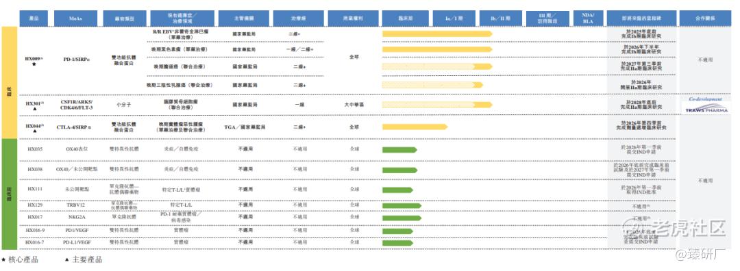 翰思艾泰目前已开发由共十种候选药物组成的管线,包括核心产品HX009及两种主要产品HX044及HX301,其中有八种针对肿瘤科的候选药物及两种针对自身免疫疾病的候选药物。