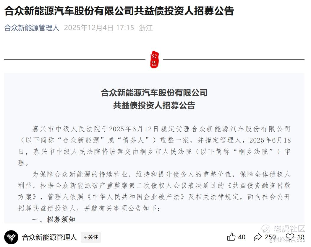 12月2日,哪吒汽车母公司合众新能源重整管理人启动经营管理受托方招募,仅两天后,管理人再发公告招募共益债投资人,计划融资不超1亿元,资金将专项用于水电费、员工工资、生产线维护及车主售后等核心运营开支。这一连串动作,是这家曾为新势力黑马的车企陷入破产重整后,全力“续命”的关键举措。