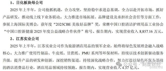 2025年上半年,控股子公司江苏实业作为日化板块的核心支柱,实现营收4.37亿元、净利润644.03万元,主要依赖酒店用品与基础口腔护理产品的销售。母公司日化板块营收仅8857.16万元,芳草公司营收1530.02万元,传统优势品牌的市场影响力持续弱化。