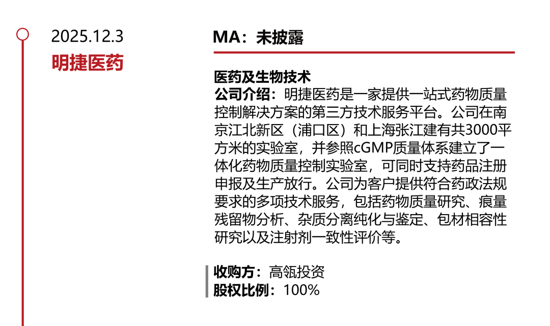 Hillhouse投资集团(高瓴资本)已完成对南京明捷生物检测有限公司的全资收购。这是继10月高瓴以约28亿元收购药明康德旗下康德弘翼、津石医药100%股权后,再次出手收购“药明系”资产。此次,药明康德将其药物质量研究平台明捷医药出售给高瓴资本,叠加此前转让康德弘翼、津石医药等资产,显示公司正逐步剥离临床CRO及部分药物质量研究等非核心业务,聚焦CRDMO模式。同时,此举也反映了高瓴在国内医药外包(CRO/CDMO)服务领域的持续加码与战略布局。