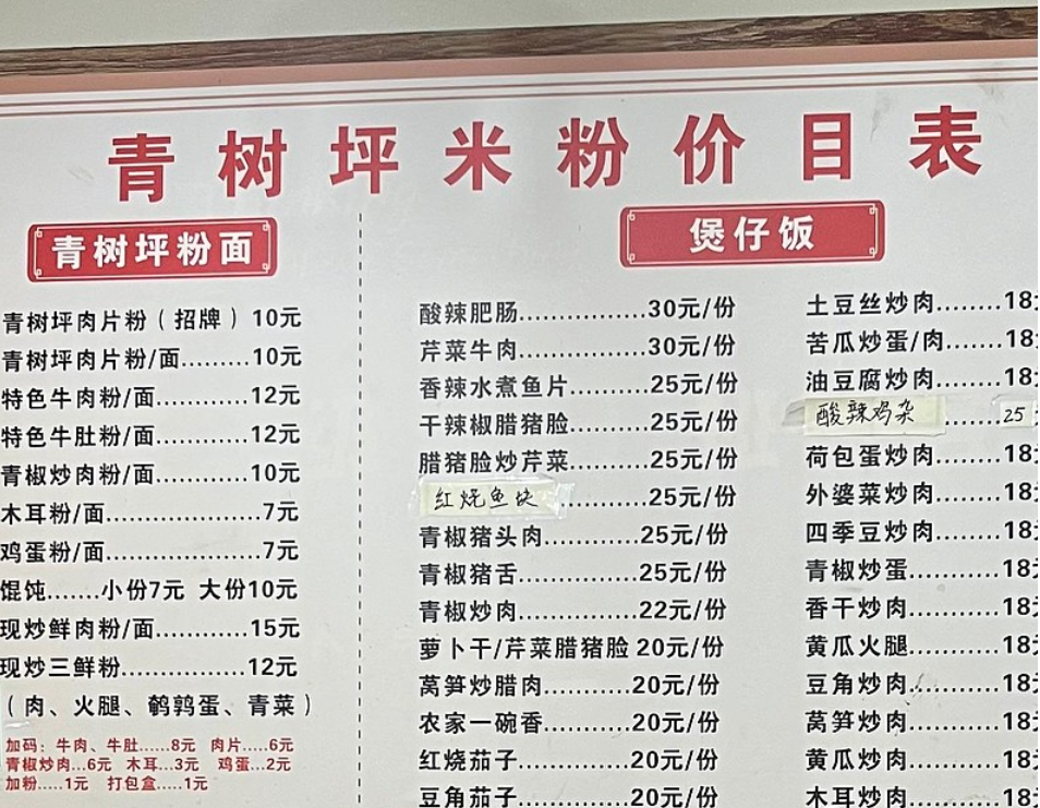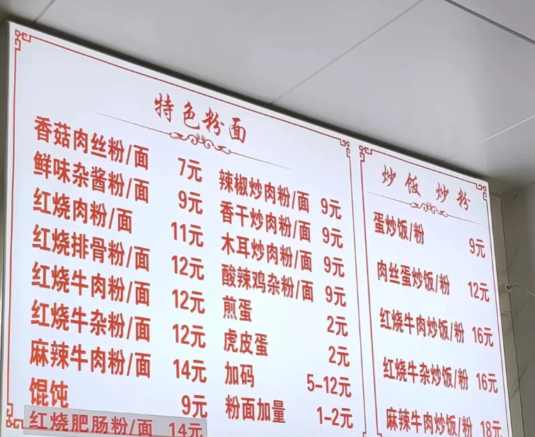 中西部三线城市的街头小店,素的粉面大概是5元左右,荤的粉面饭10元左右,最多也就12元。像我老丈人镇上,8元能吃到新鲜口感不错的牛肉粉。下图是湖南娄底市里一份粉店的价格表。