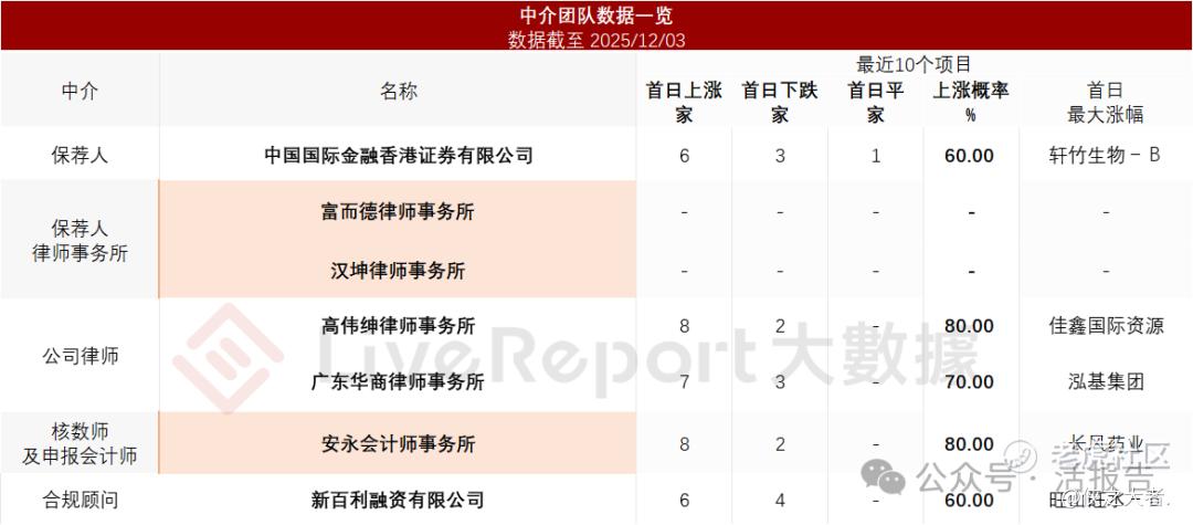 据**大数据统计,大族数控中介团队共计7家,其中保荐人1家,近10家保荐项目数据表现中规中矩;公司律师共计2家,综合项目数据表现稳妥。整体而言中介团队历史数据表现尚可。