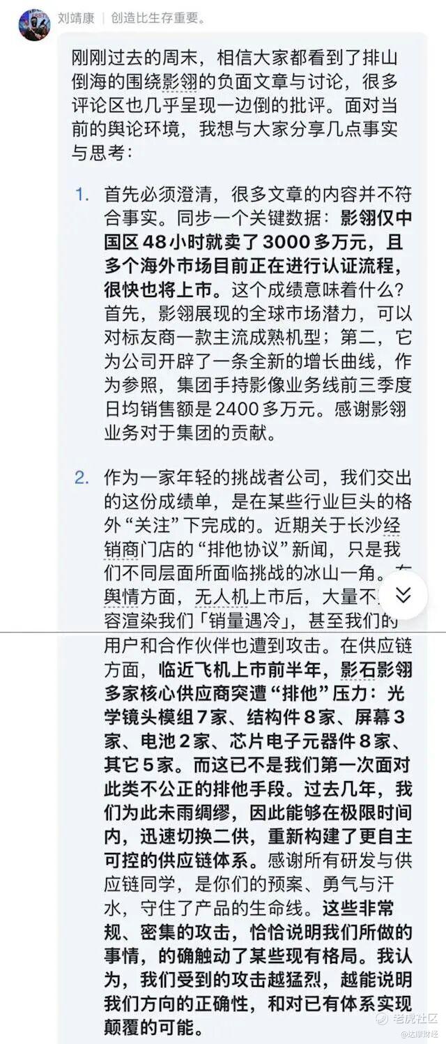 12月8日晚间,影石创新(688775.SH)创始人、董事长刘靖康在公司全员群发布公开信,对新款无人机面临的竞争与质疑等问题作出回应。