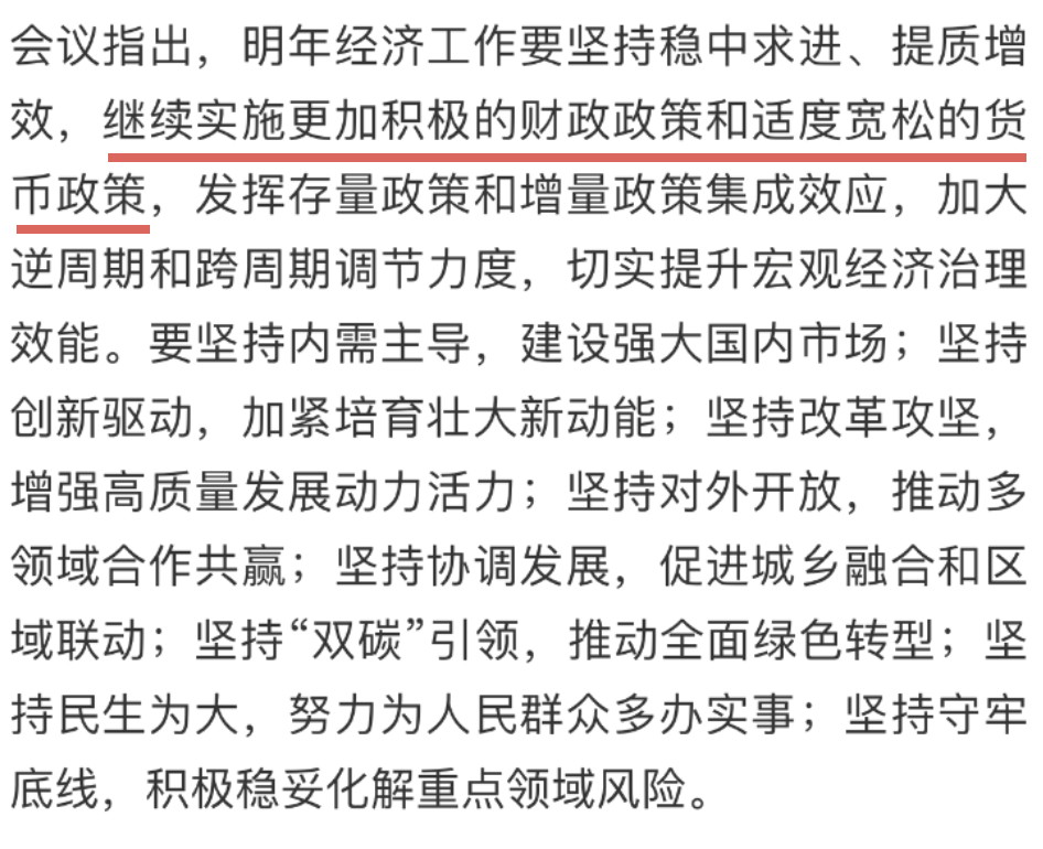 像“更加积极”、“适度宽松的货币政策”这两条是重中之重。这两年提振经济,政策面很积极了,这次提到更加积极,给市场无限想象(这是目前做多喜闻乐见的)。