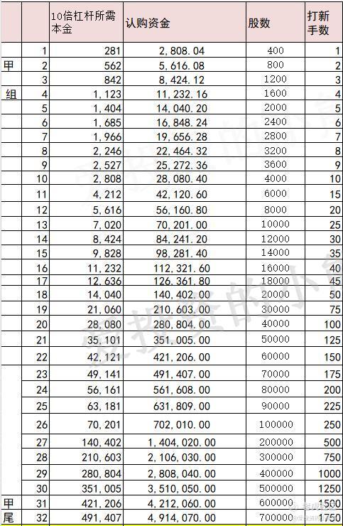 甲组的各档融资所需要的本金还有融资金额对应如下表: