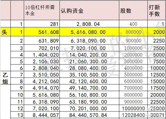 乙头需要认购资金562万,乙组的各档融资所需要的本金还有融资金额对应如下表: